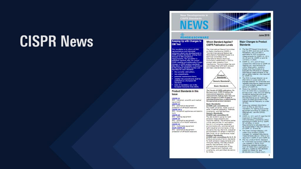 Los estándares de cumplimiento de EMI y EMS cambian constantemente. CISPR News es un excelente recurso para mantenerlo informado sobre los últimos cambios. Conozca los nuevos desarrollos en los estándares de productos CISPR, que surgen de los cambios en las mediciones de cumplimiento de EMI y EMS. Es una descripción completa de cada estándar: